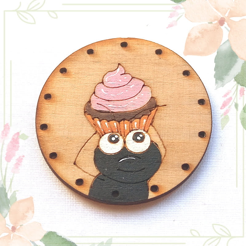 Figura realizada en madera de contrachapado de 3mm con registro alimenticio. Lavable en agua fría y a mano. Pintado a mano y preparado para ser cosido a festón con el dibujo de una hormiga con una magdalena en sus patas.