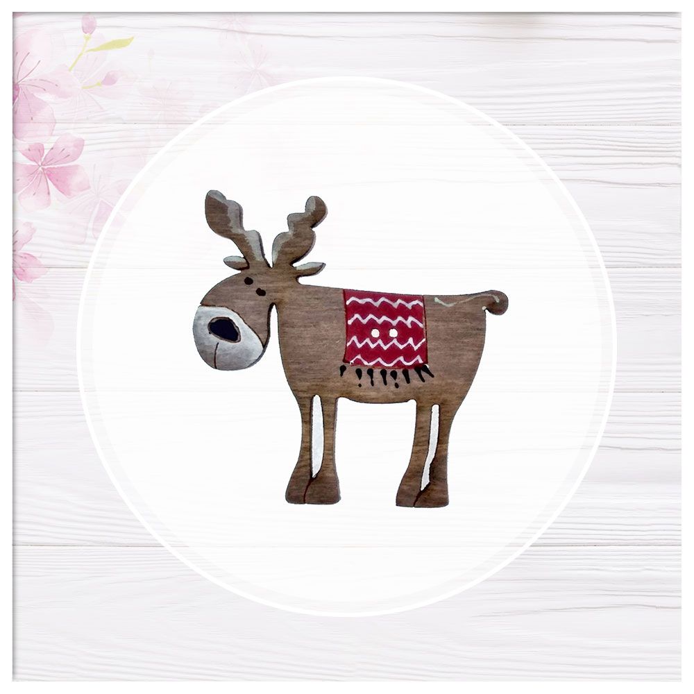 Botón navideño con forma de carita de reno, hecho en madera y pintado a mano.
