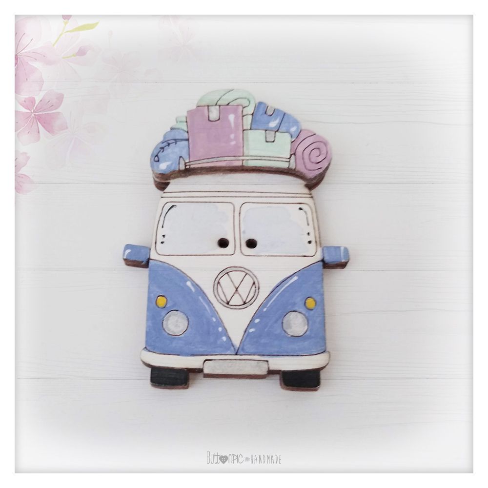 Botón con forma de caravana con un perro, realizado en madera y pintado a mano, tiene piezas superpuestas para crear un efecto 3d