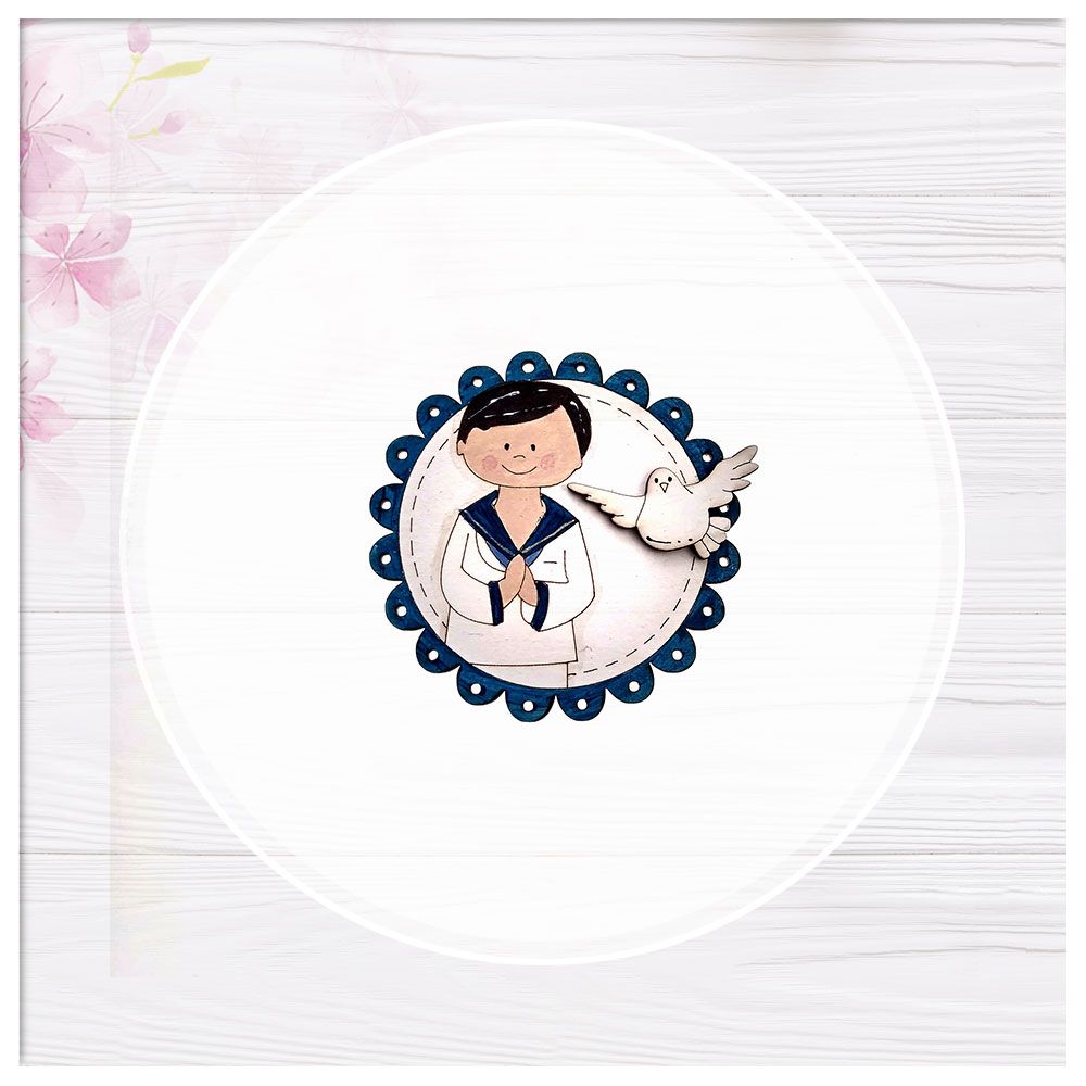 Etiqueta de niño vestido de comunión con una paloma, están hechos en madera y pintados a mano