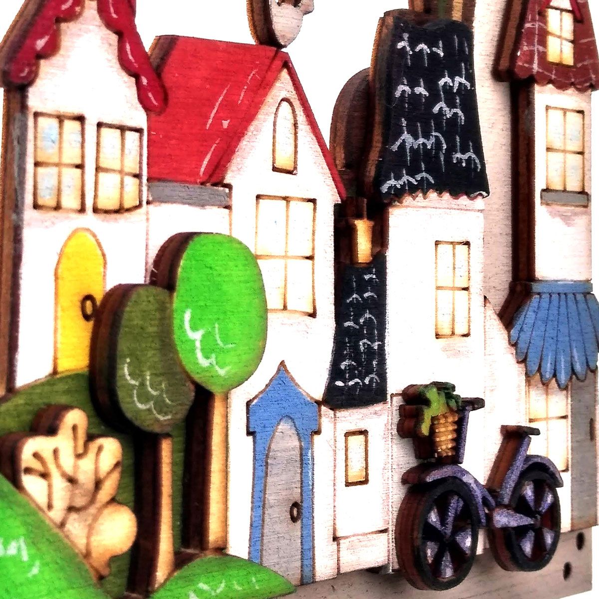 Esquina decorada con casitas de ciudad, está realizada en madera de 4mm y pintada a mano, se venden por par mirando en espejo (el precio corresponde al par). Tienen figuras superpuestas para crear un efecto 3d