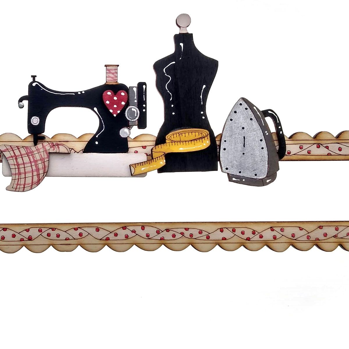 Percha decorada con motivos de costura, está realizada en madera de 4mm y pintada a mano, tiene piezas superpuestas para crear un efecto 3d