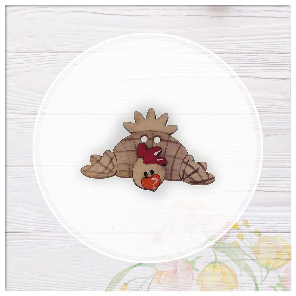 Botón con forma de pollito, realizado en madera y pintado a mano, tiene piezas superpuestas para crear un efecto 3d