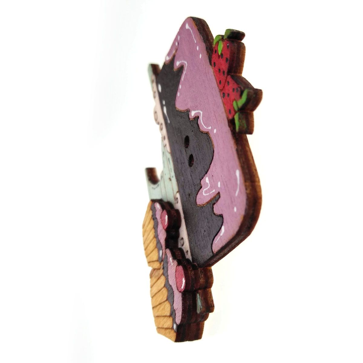 Botón con forma de tarta con copcakes, realizado en madera y pintado a mano, tiene piezas superpuestas para crear un efecto 3d
